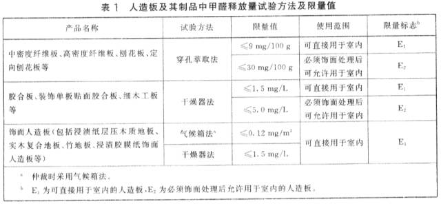 下图为强制标准GB 18580-2001《室内装饰装修材料人造板及其制品中甲醛释放限量》所要求的甲醛释放限值: